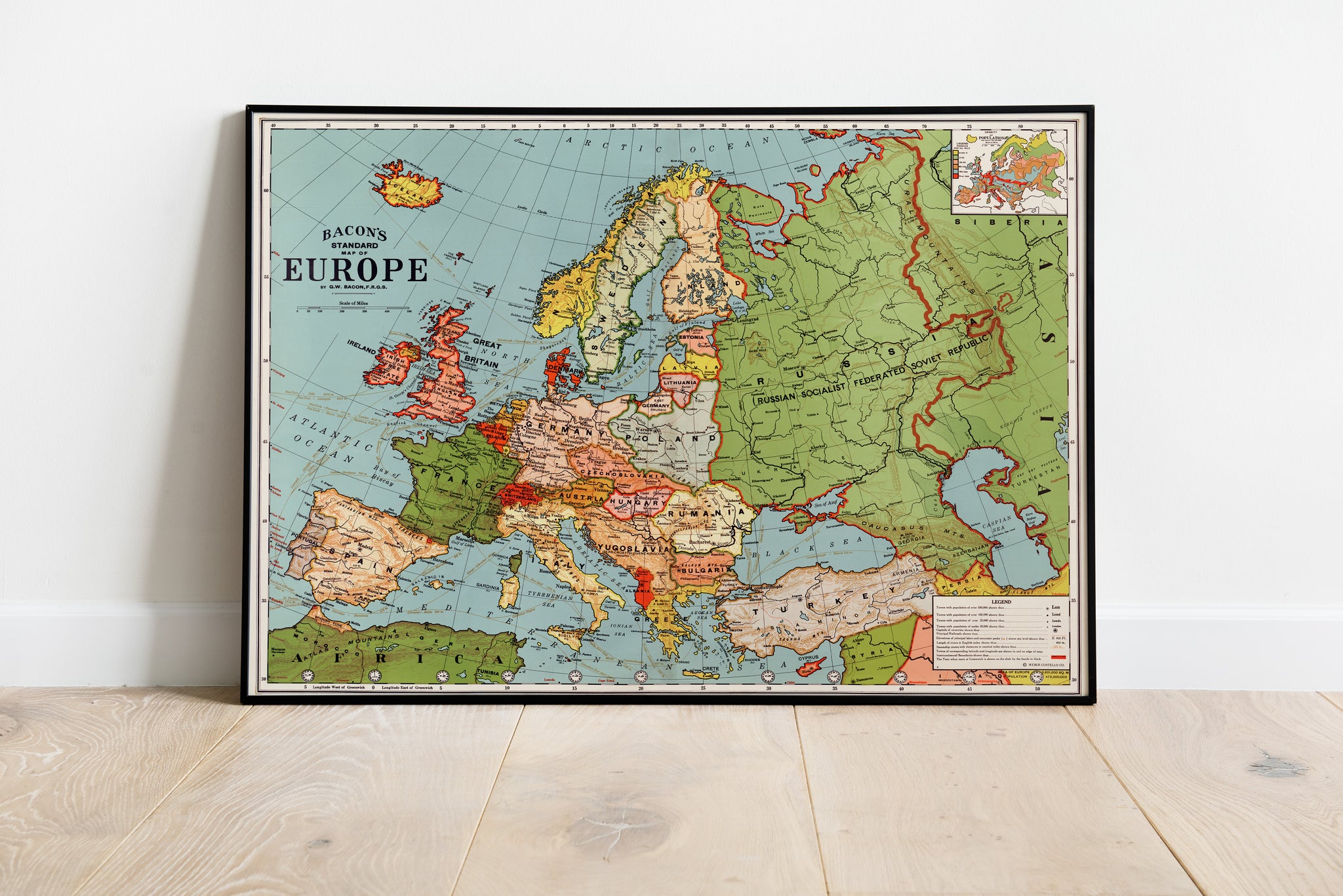 A timeless cartographic piece for interiors shaped by history, travel, and ideas. This Bacon's Standard Map of Europe poster brings antique atlas character into the room with a layout that feels both decorative and deeply informative.