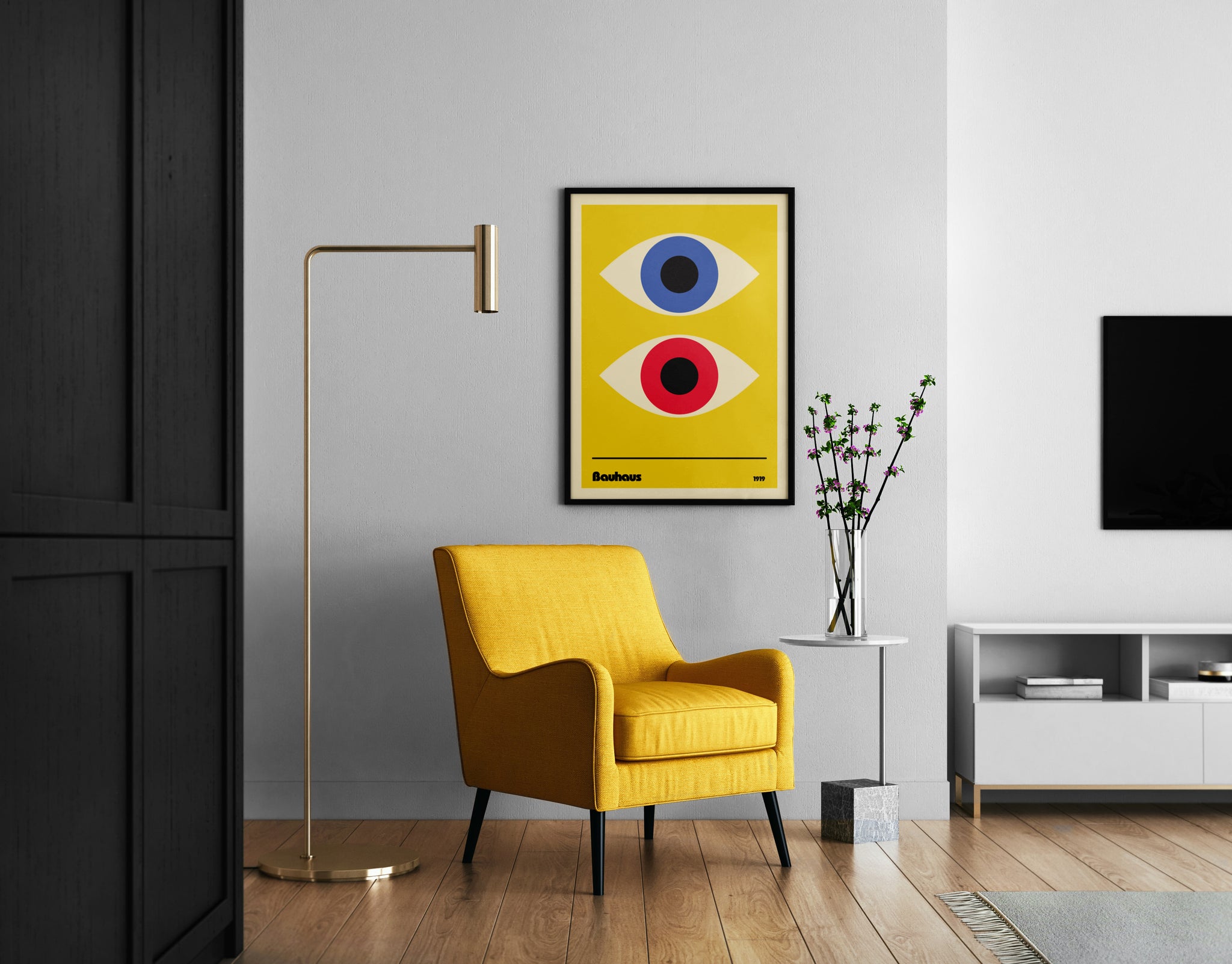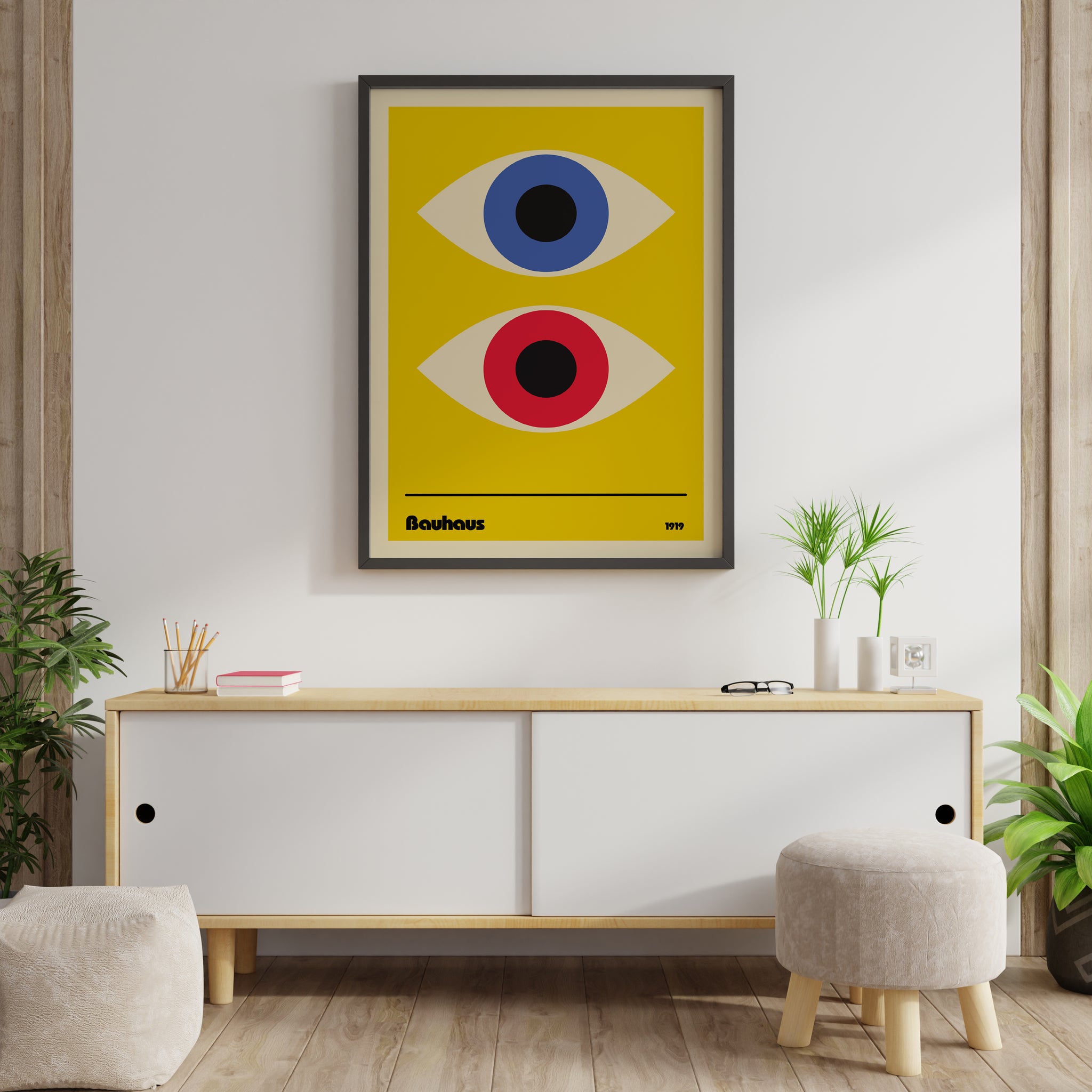 Bold Bauhaus-inspired geometric wall art print with striking eye motif and primary colors. A modern abstract poster designed to elevate contemporary interiors, creative studios, and mid-century modern spaces. Perfect statement wall signal for design lovers and minimalist homes.