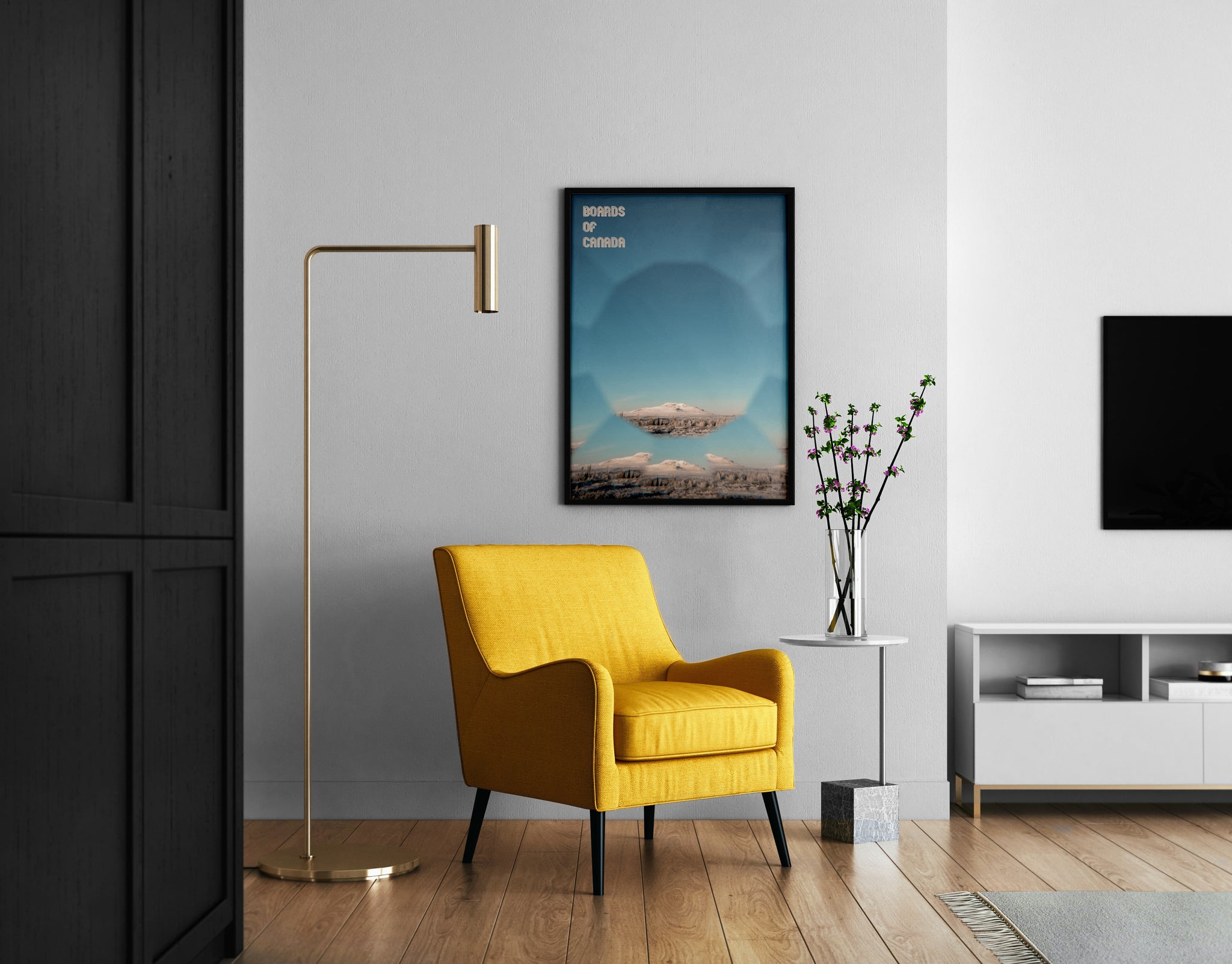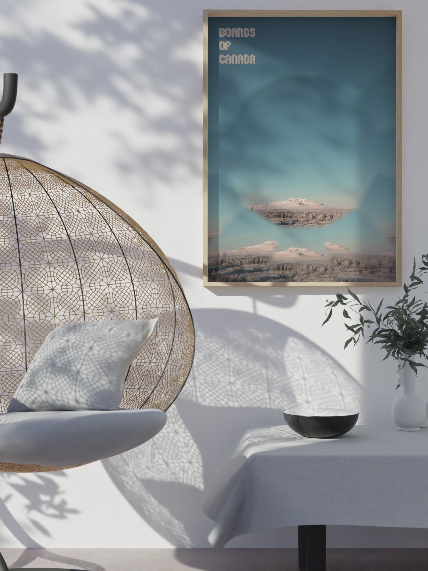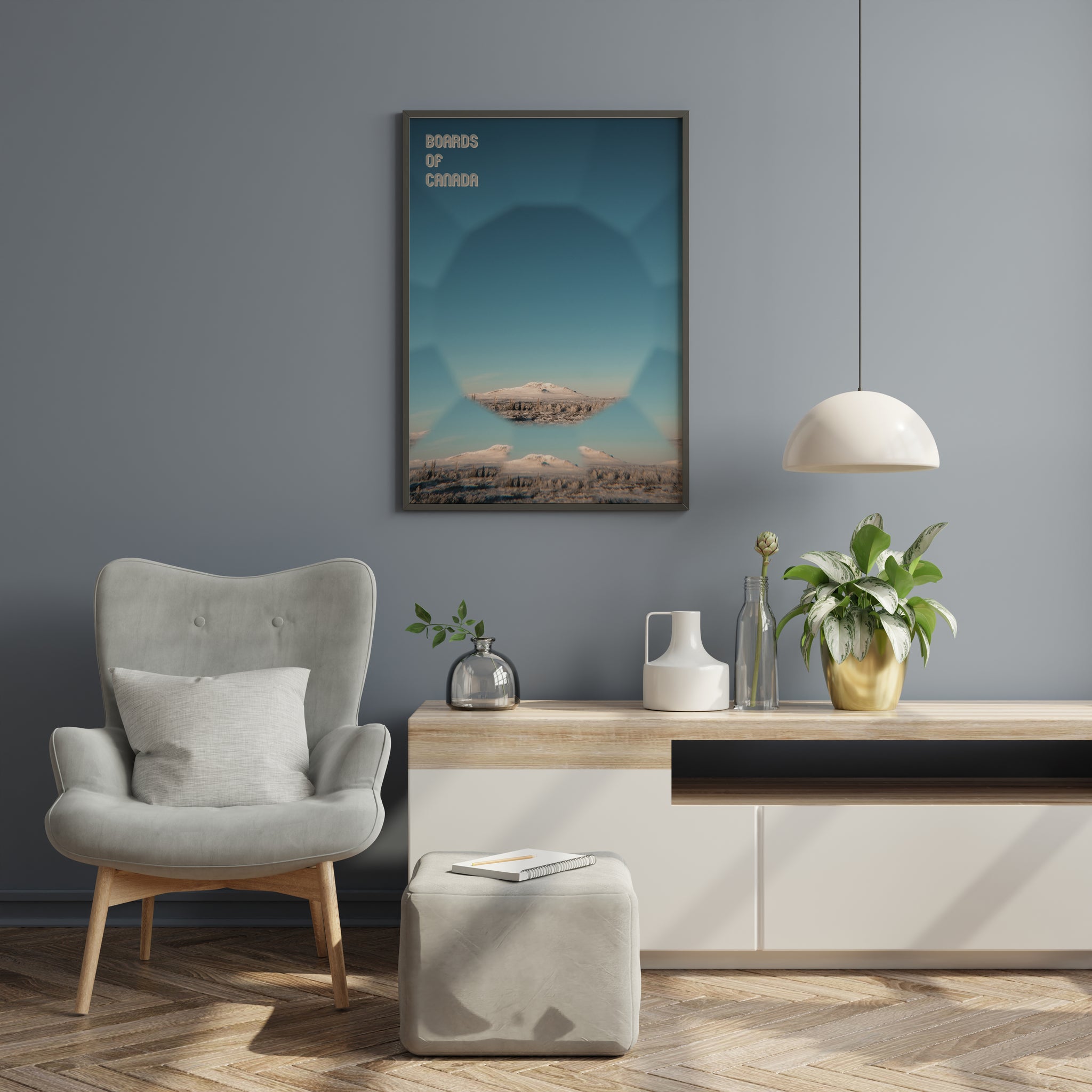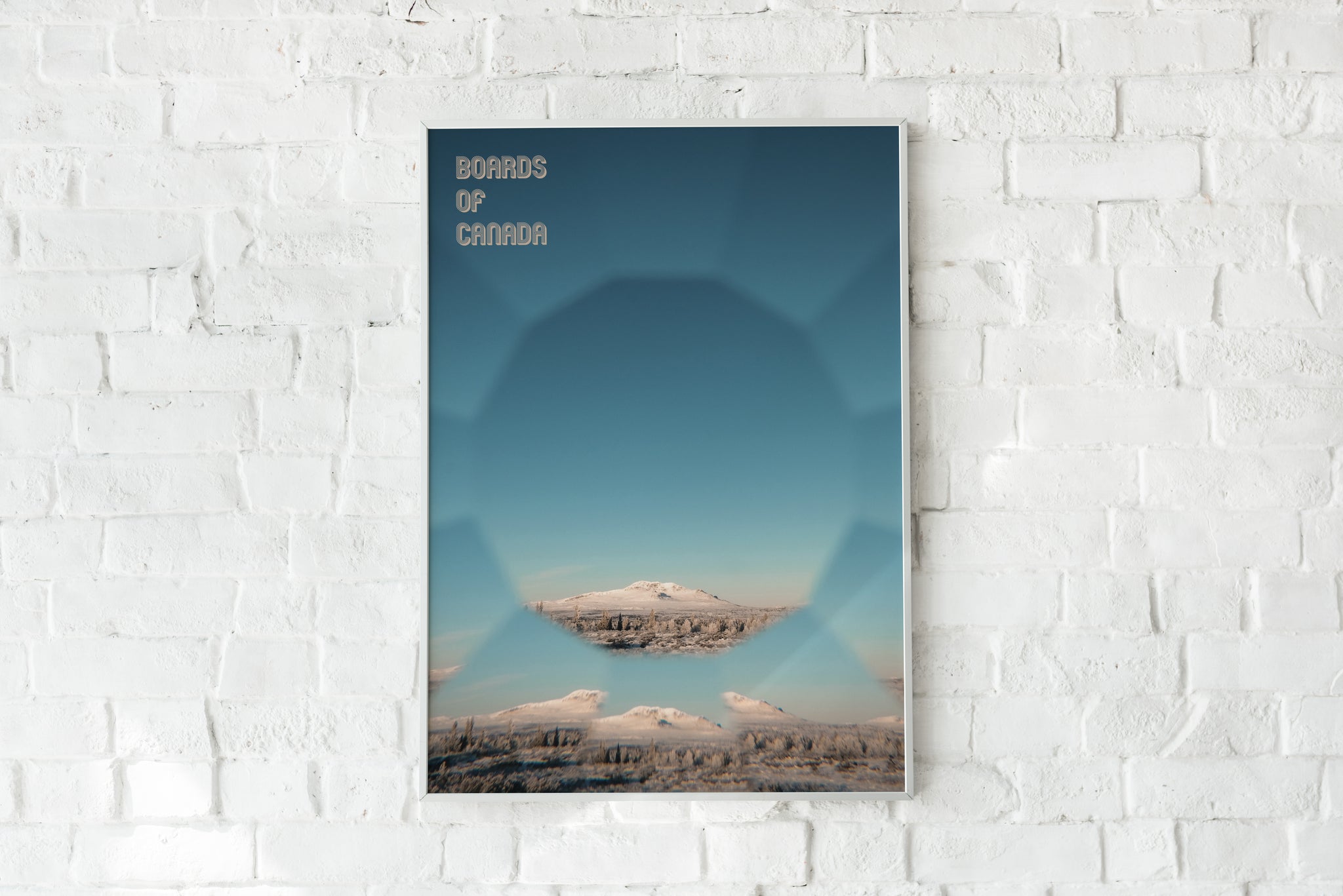 This poster print features a soft-focus mountain landscape with mirrored geometric framing and clear Boards of Canada typography, echoing classic ambient album cover design. Ideal for living rooms, studios, offices, or gallery walls, it brings a calm, nostalgic electronic aesthetic into modern interiors.