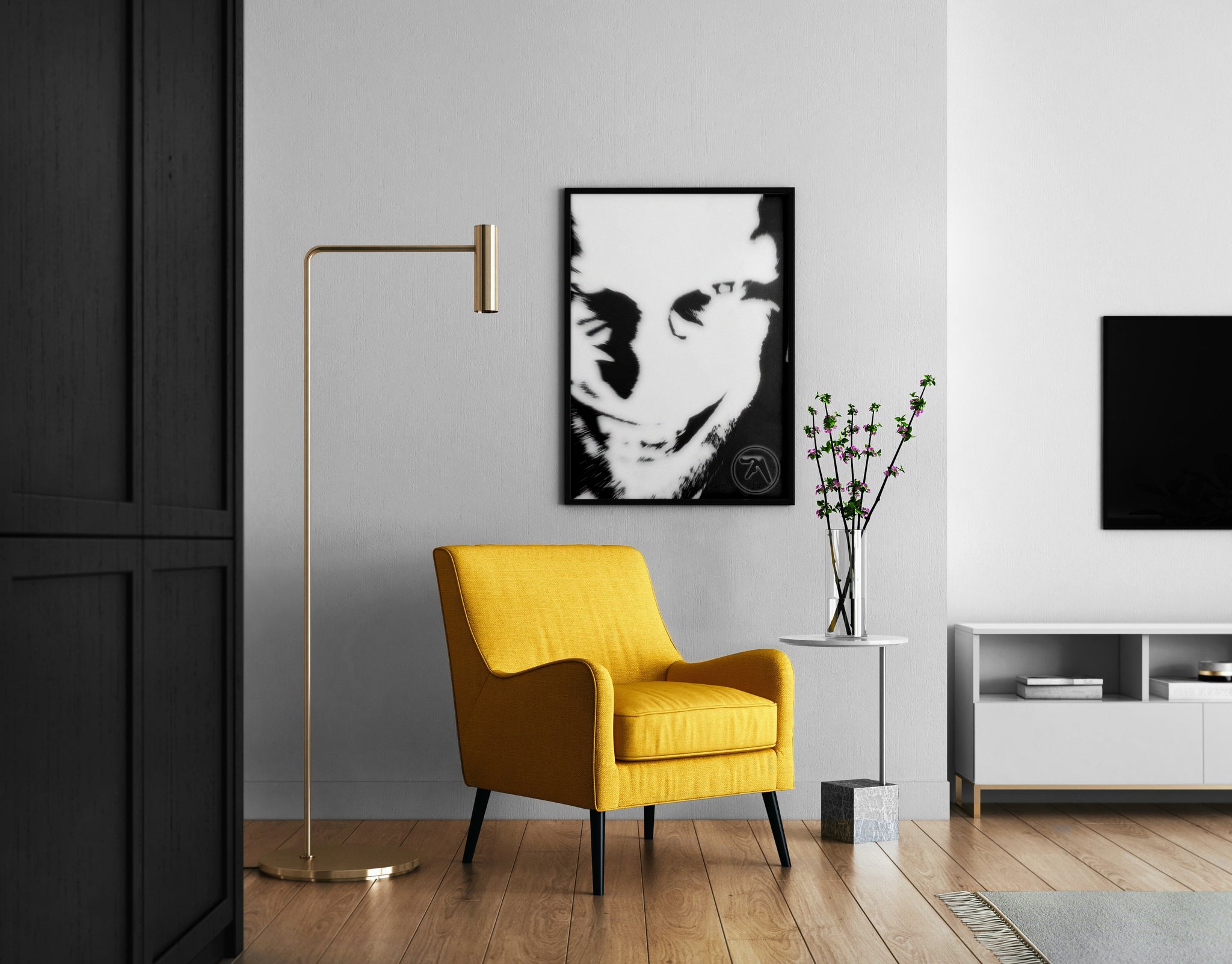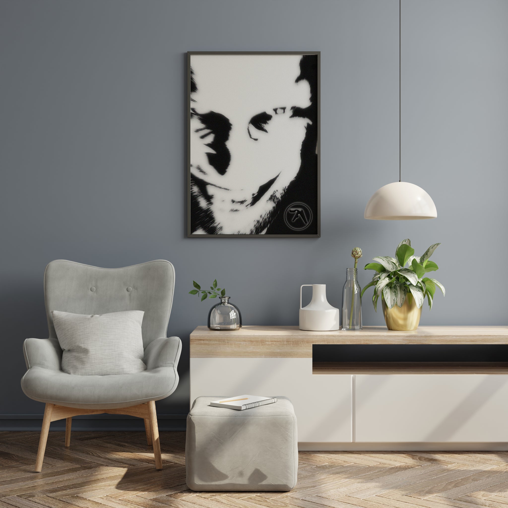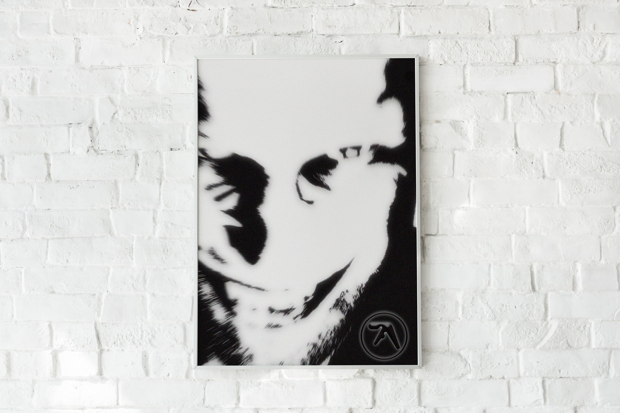 This dark portrait poster print features a high-contrast black and white face with a minimal logo detail, creating a bold album cover style look. Ideal for living rooms, studios, creative offices, or gallery walls, it adds a moody electronic aesthetic to modern interiors.