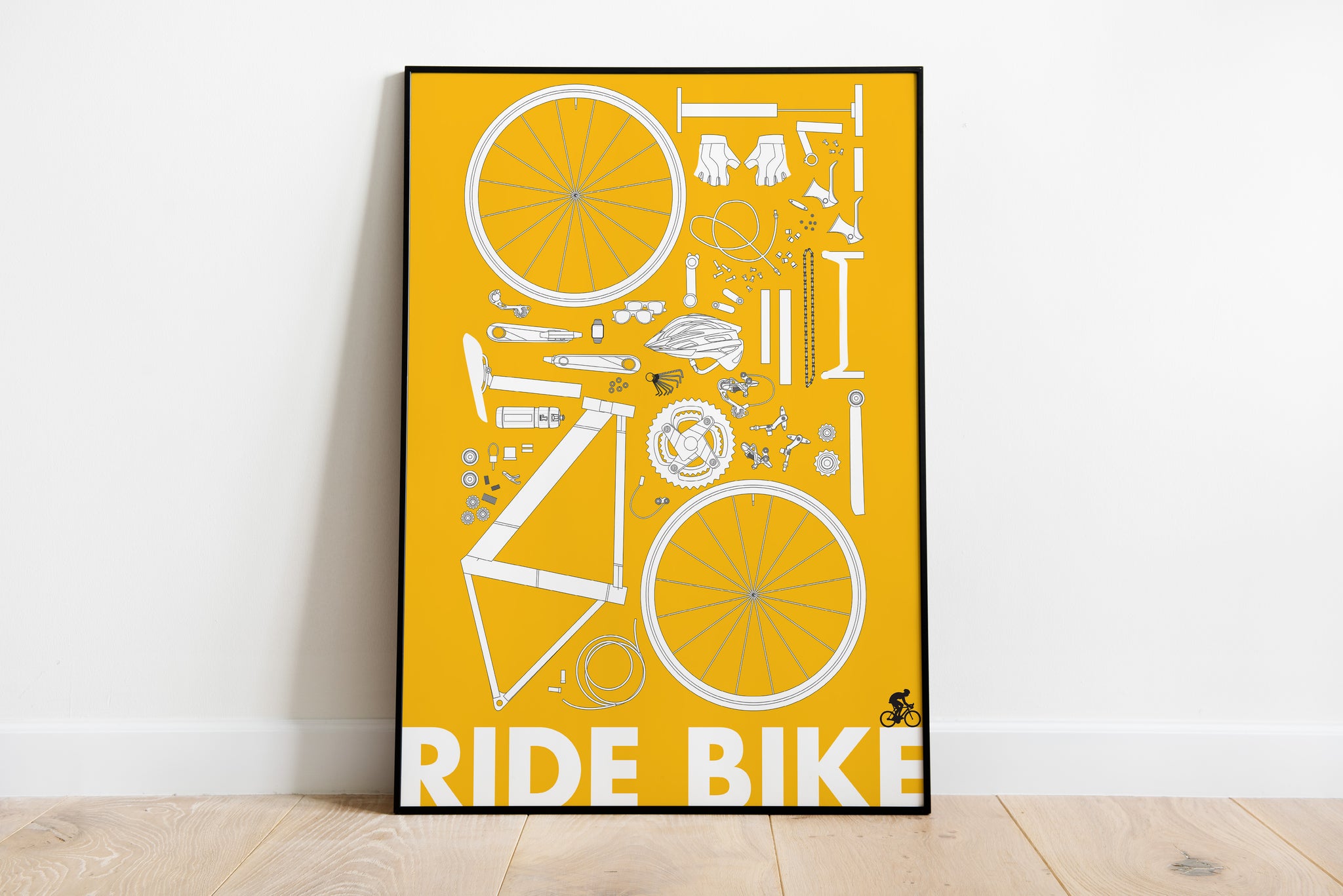 A bold trio of cycling-inspired graphic posters featuring a minimalist bike silhouette, dynamic road rider, and technical parts layout. Warm orange, deep green, and yellow tones create a modern retro look perfect for living rooms, home offices, or creative studios.