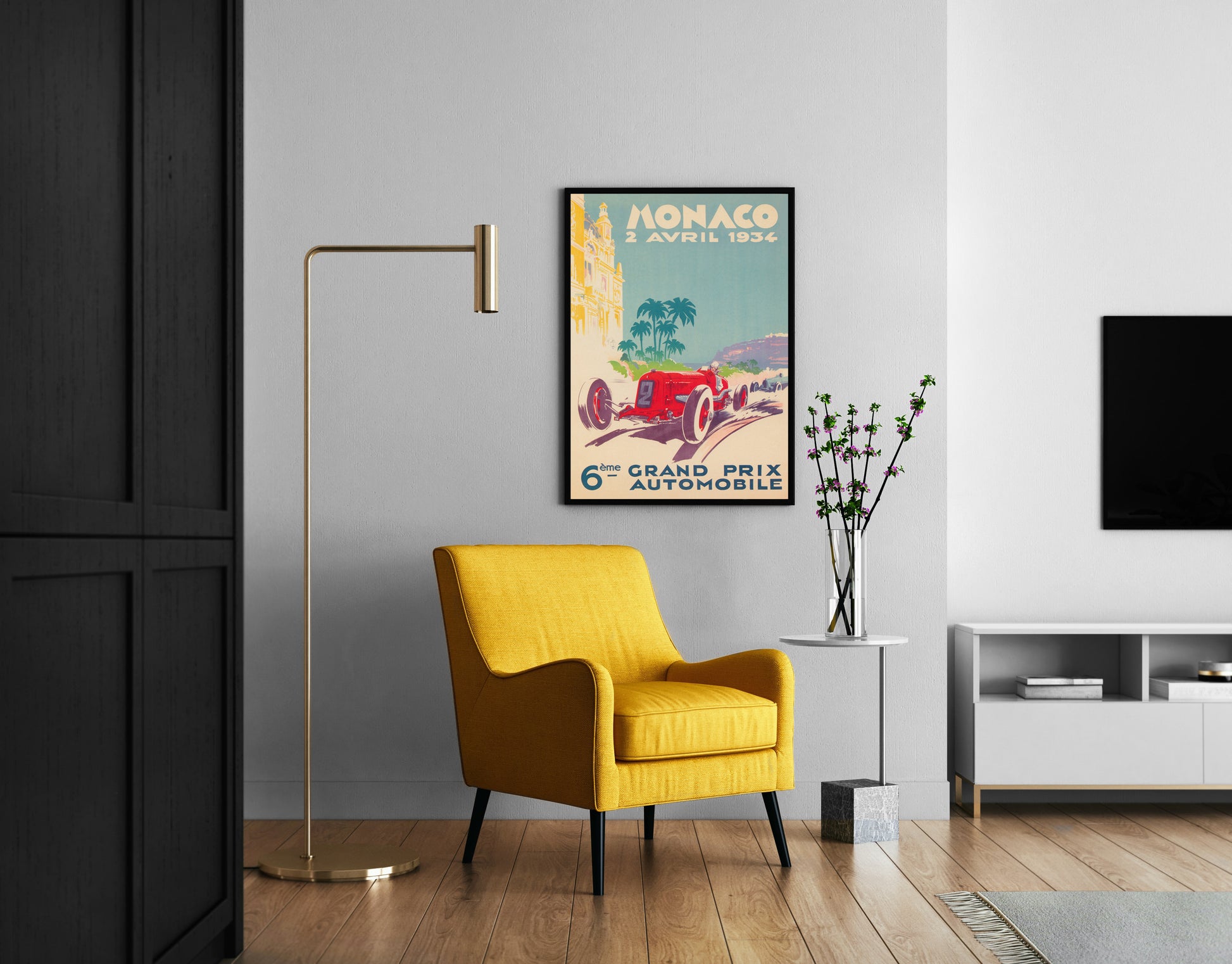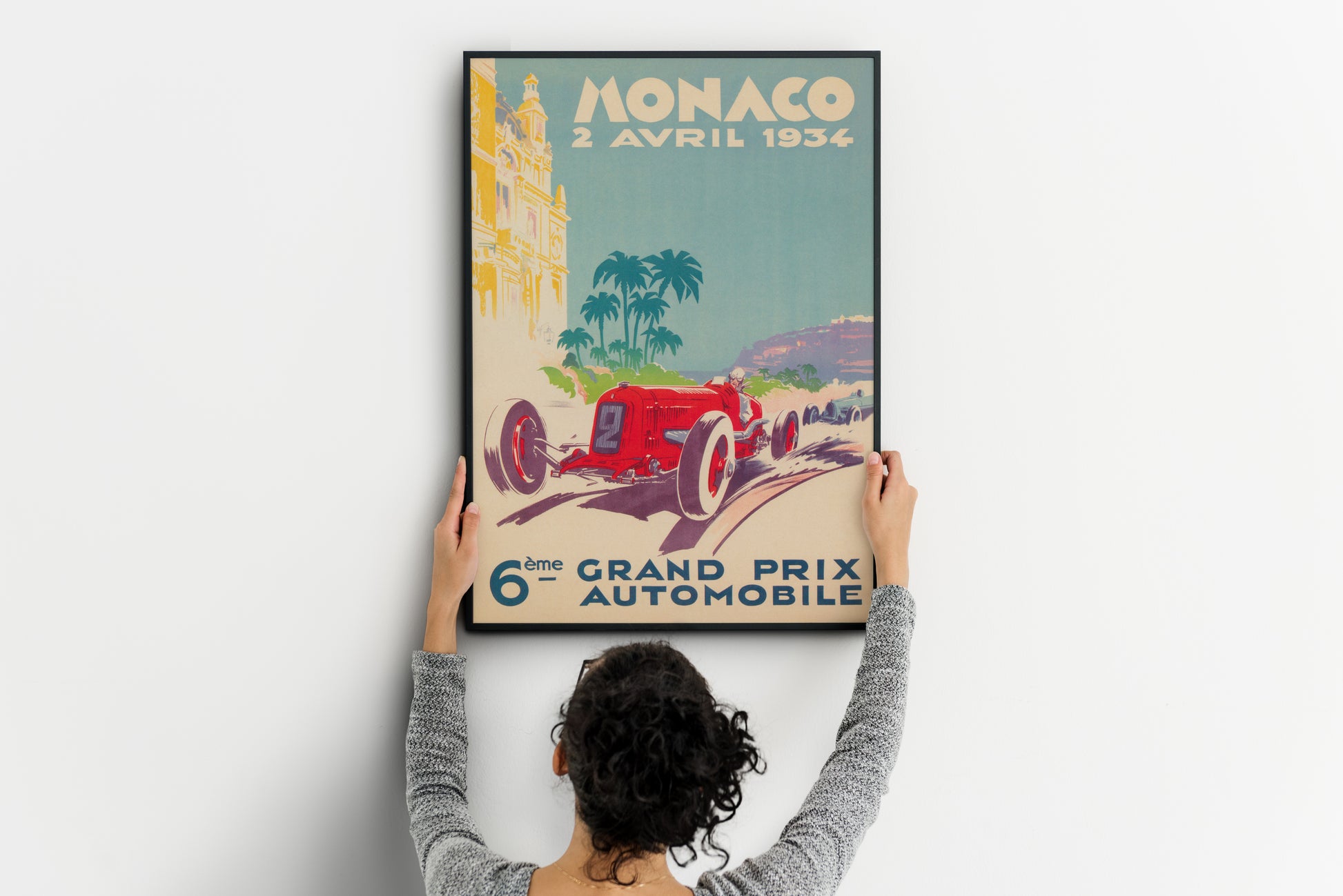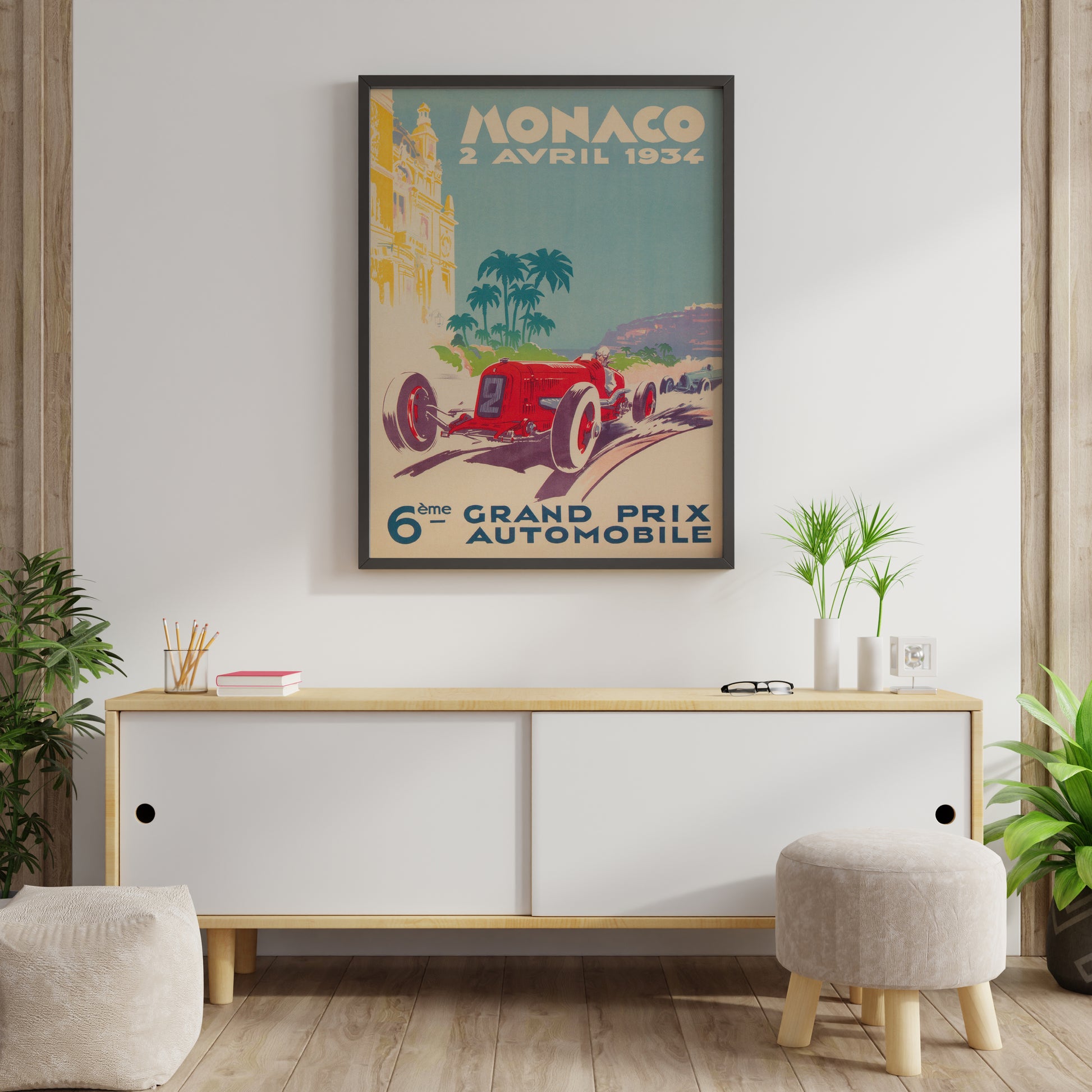 A striking vintage racing poster inspired by the iconic 1934 Monaco Grand Prix. This classic automobile wall art captures the golden age of motorsport, early Formula racing aesthetics, and Riviera elegance. Perfect for car collectors, racing enthusiasts, and lovers of historic European travel and automotive design.