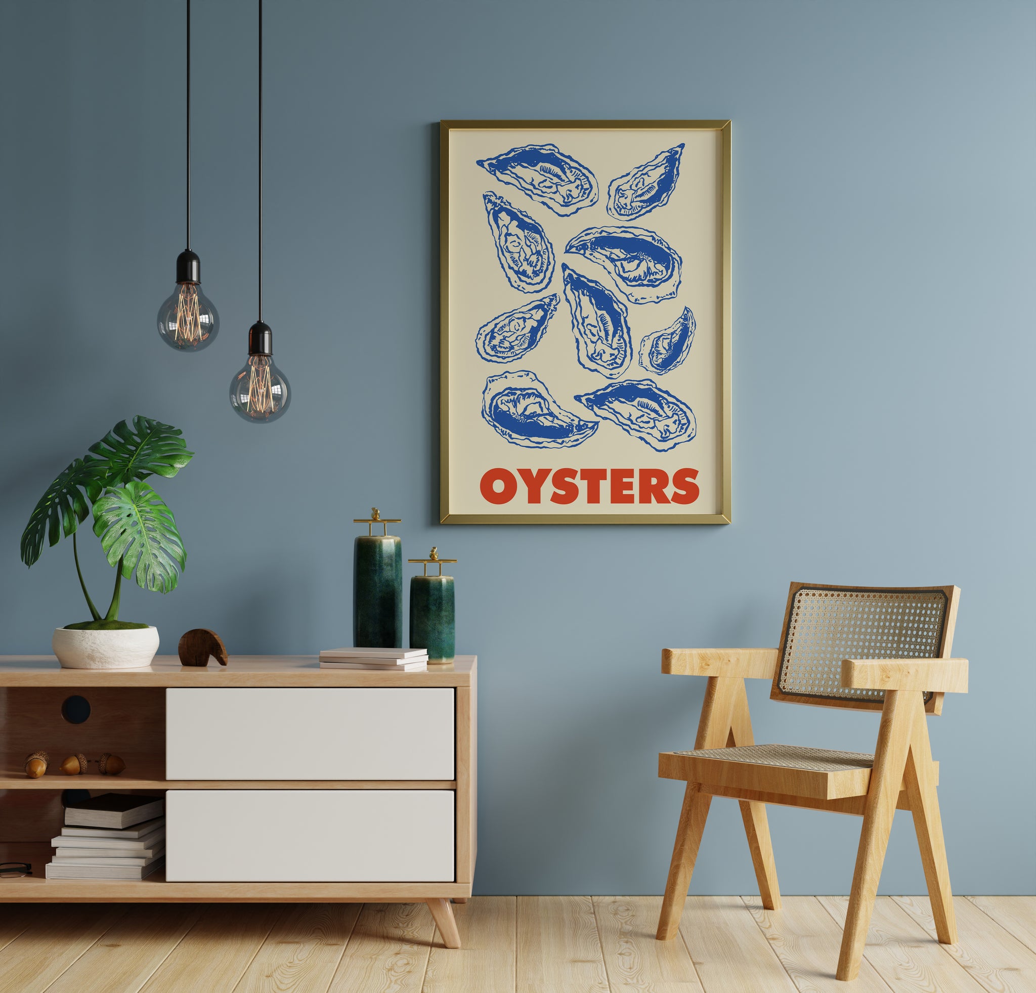 This vintage oyster poster brings timeless coastal character into your space with bold blue oyster illustration details and striking red typography. Designed as statement seafood wall art, it adds effortless nautical kitchen decor energy while staying clean, graphic, and design-forward.