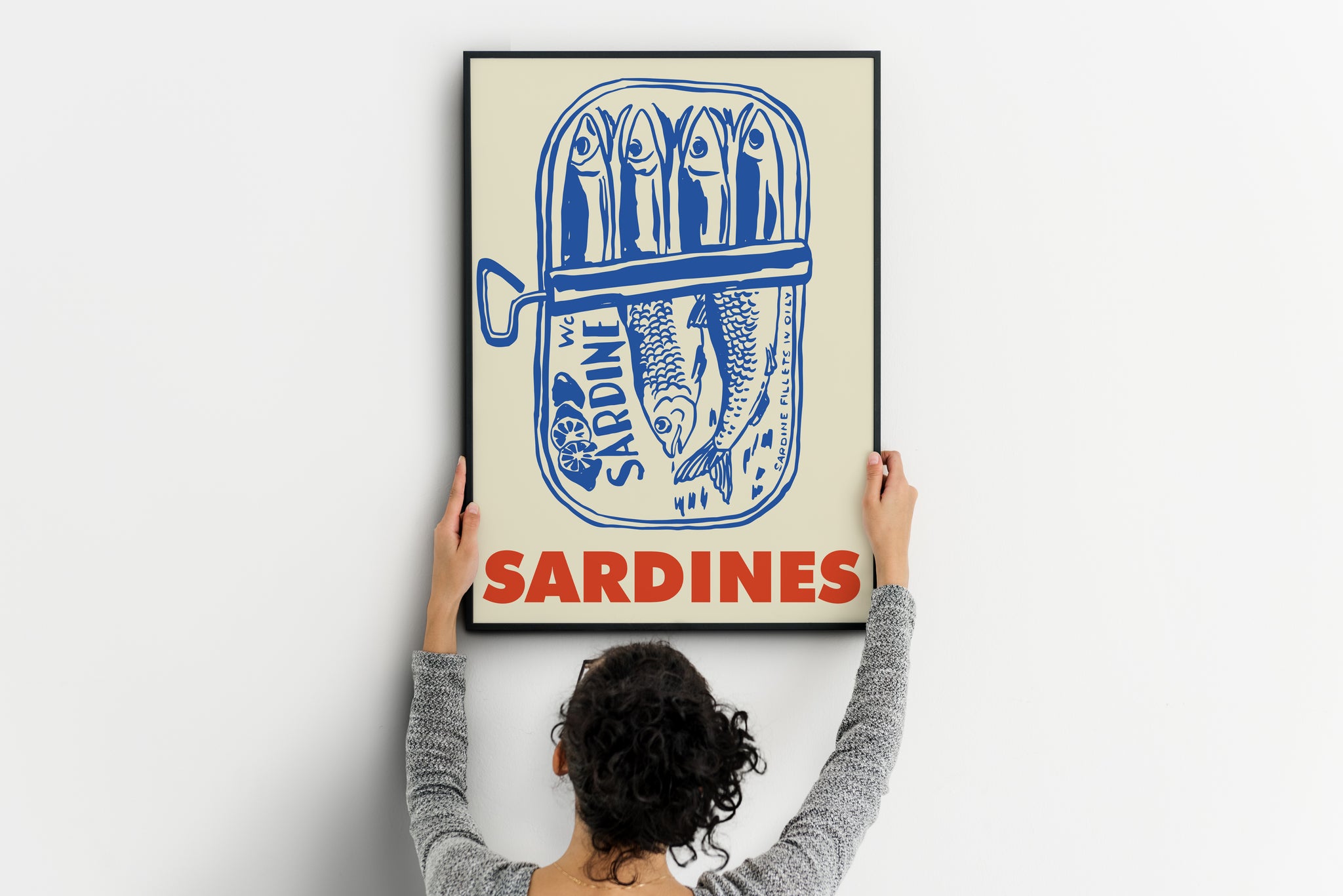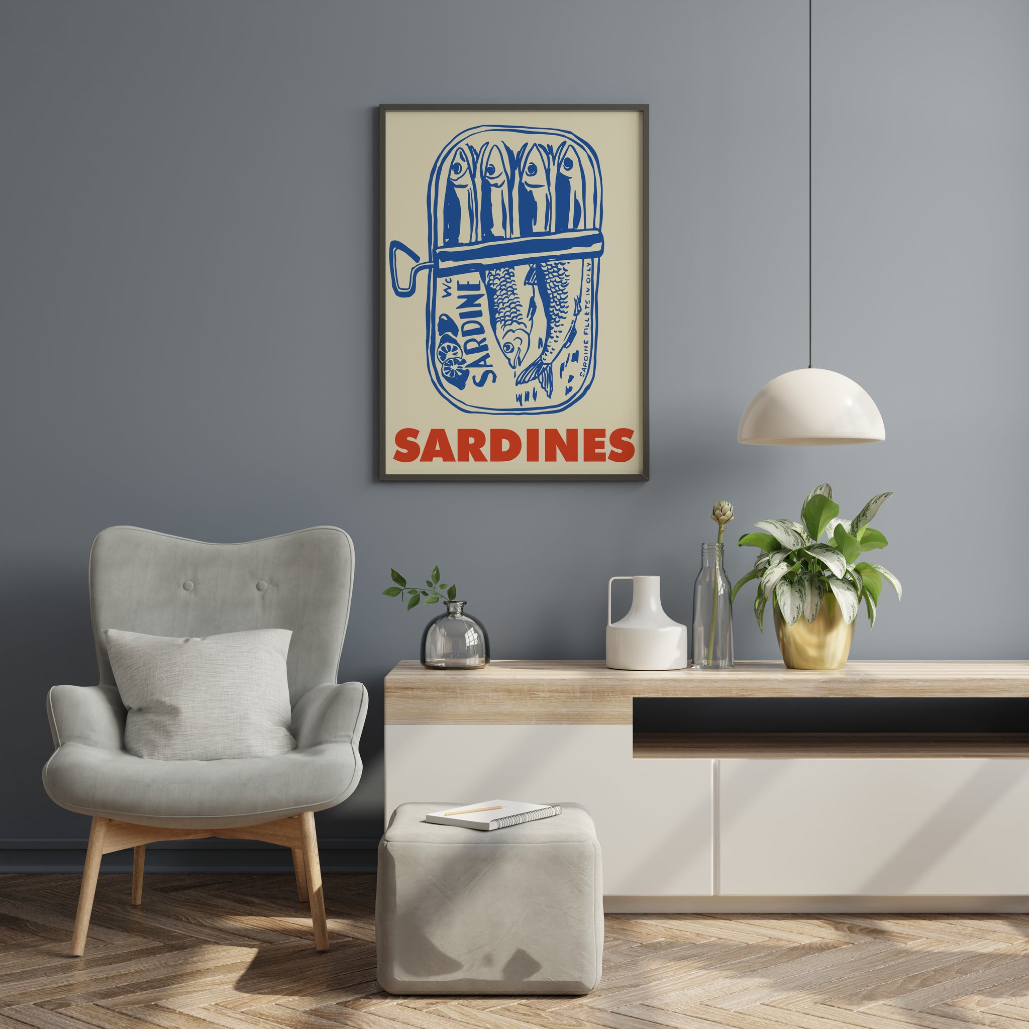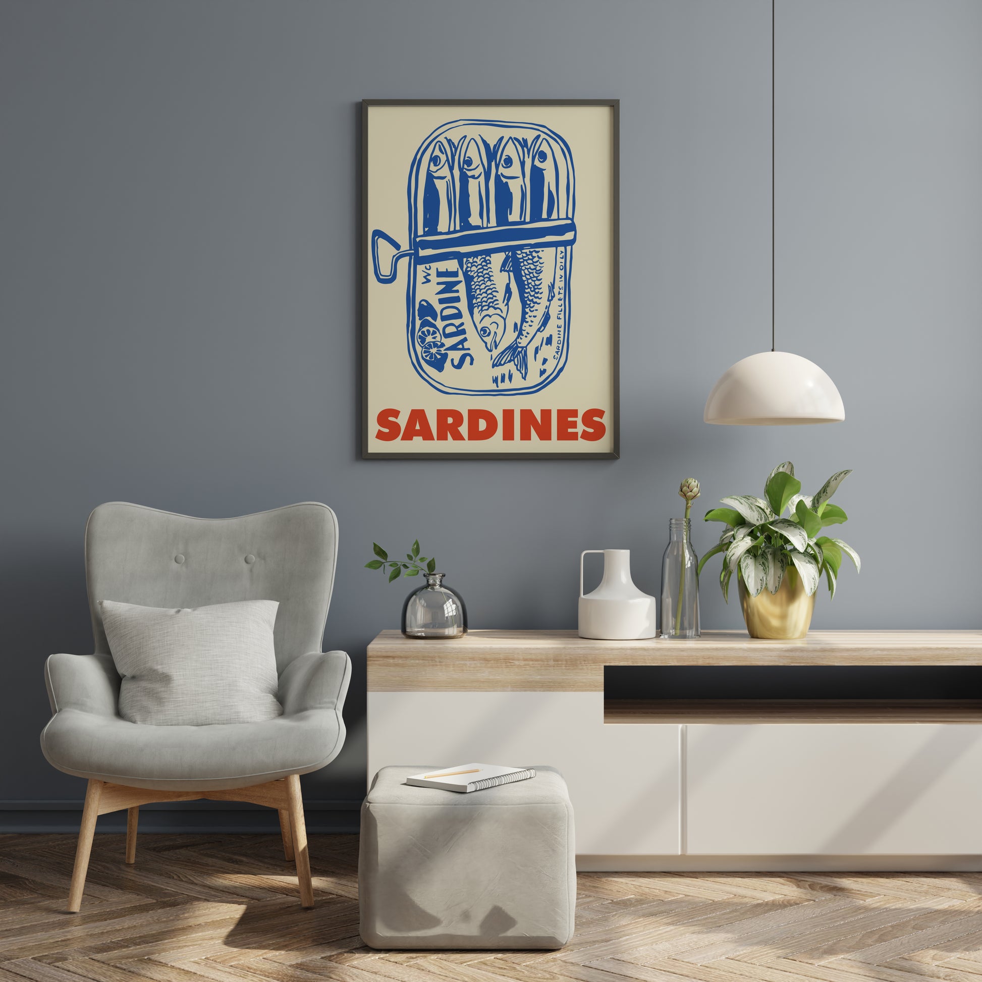 A bold retro sardines poster featuring a hand-drawn tin can illustration in deep blue with large red typography. The clean graphic style and coastal food theme bring character and warmth to kitchens, dining spaces, or modern gallery walls.