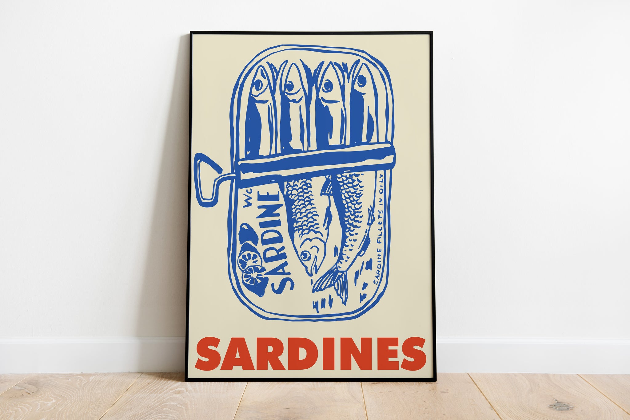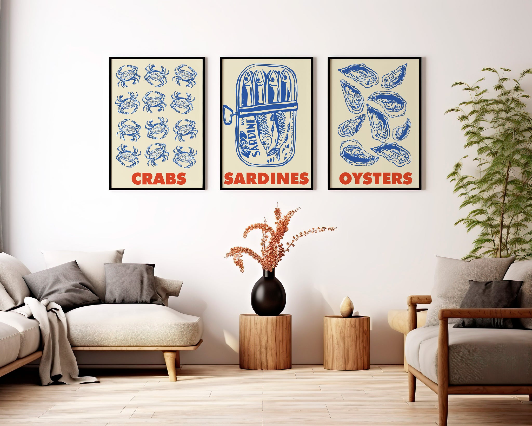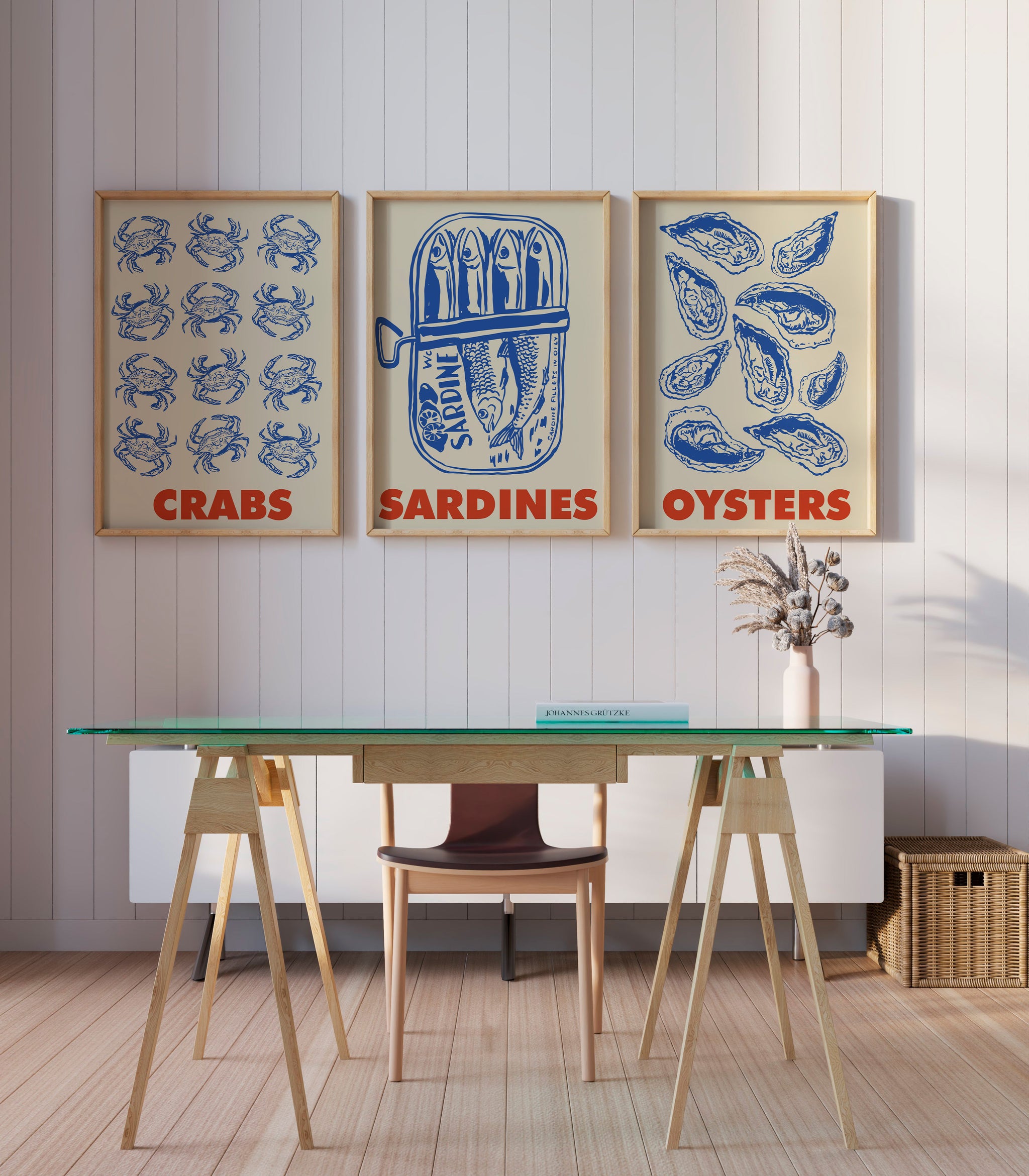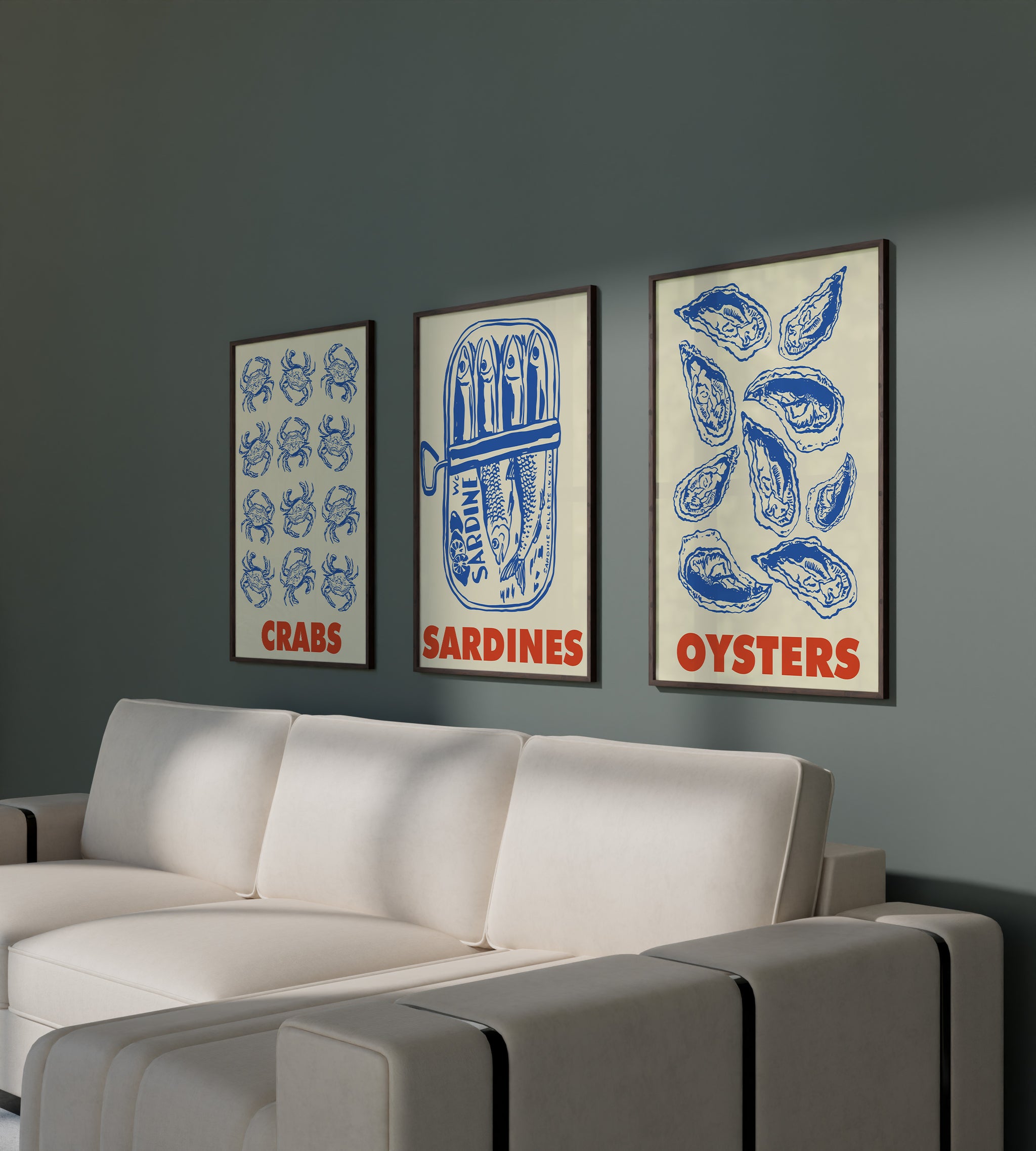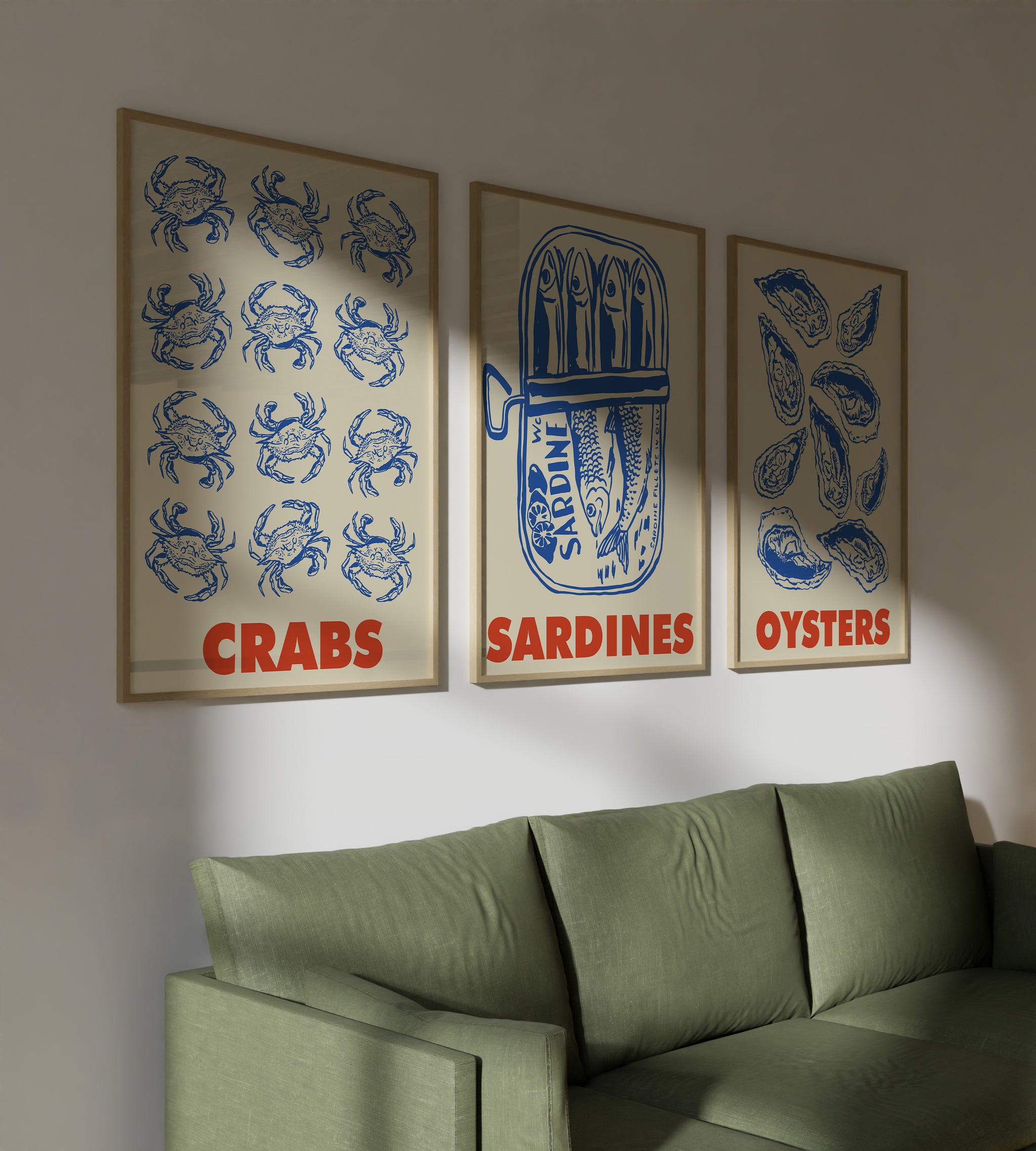 A bold seafood-inspired poster trio featuring illustrated crabs, a sardine tin, and oysters in clean blue line art with warm cream backgrounds and red typography. This modern retro set adds playful coastal character to kitchens, dining areas, or gallery walls.